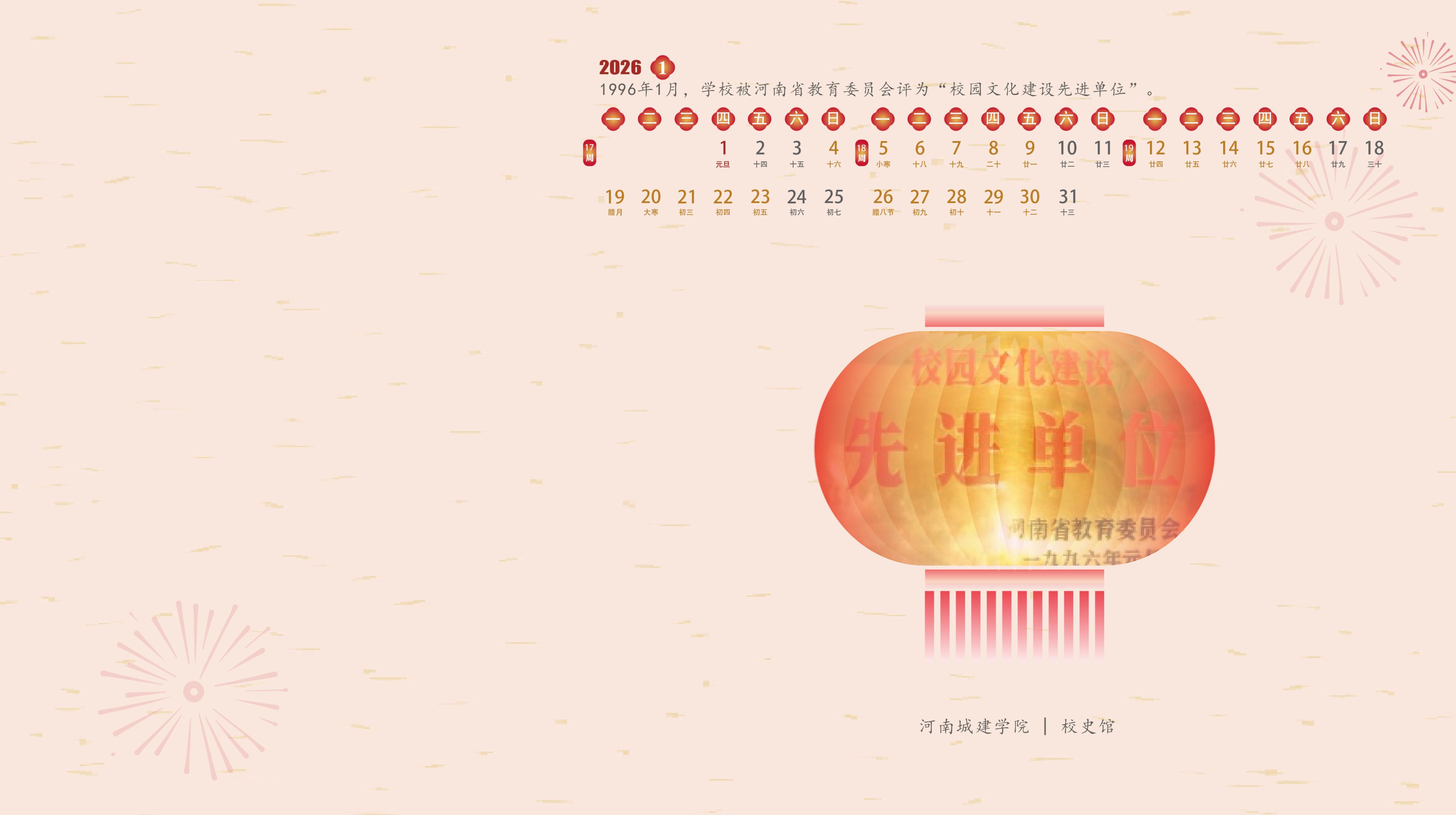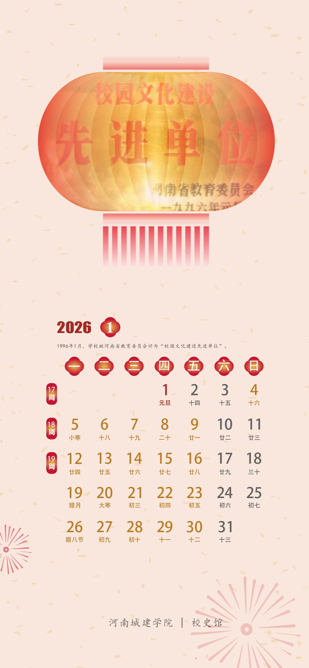 2026,新年伊始,万象更新!河南城建学院校史馆持续为师生奉上2026年1月份(2025-2026学年第一学期第17周至第19周)手机端、电脑端校历壁纸,欢迎广大师生下载使用。